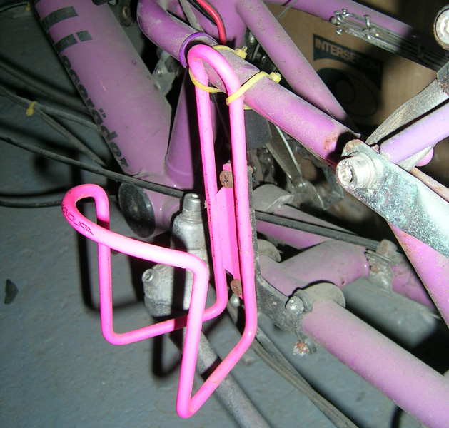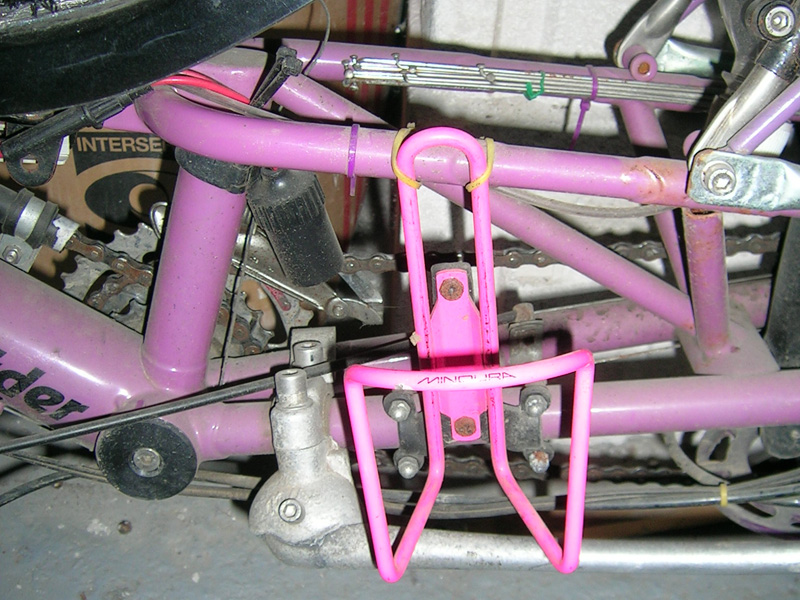 - Der Trinkflaschenhalter hängt an einem kopfüber montierten Lenkerbefestigungsteil, das an die Hintergabelstrebe geschraubt ist.