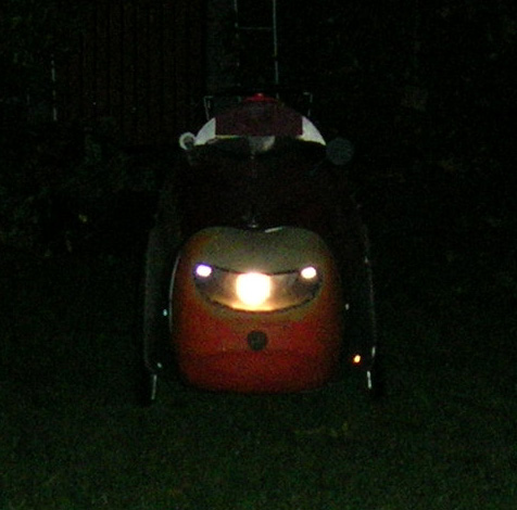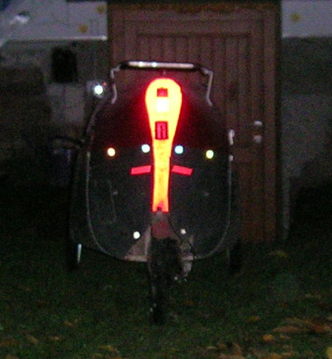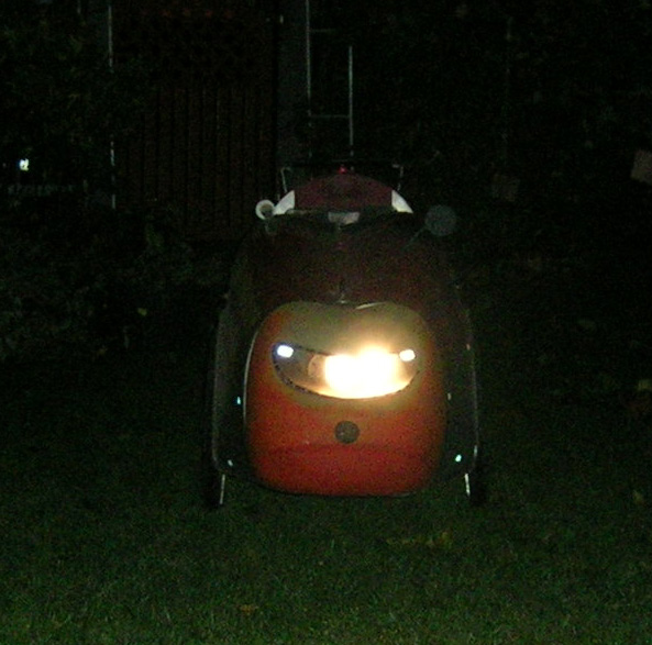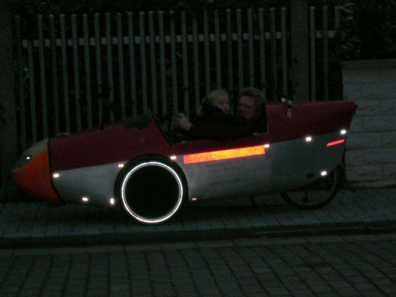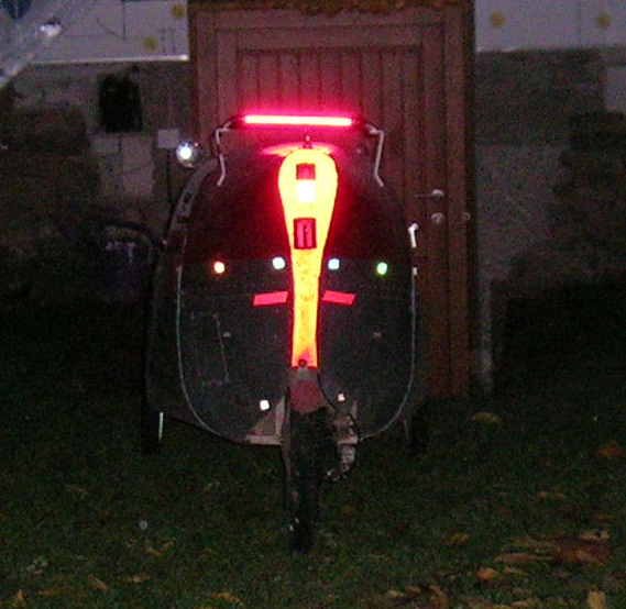 - Nach einer Diskussion über Fahrradbeleuchtung in de.rec.fahrrad habe ich ein paar Bilder gemacht, die (vorerst nur mit Blitzaufnahmen) zeigen, wie gut sichtbar das Rad mit der 12V-Akkubeleuchtung und den zahlreichen vom Vorbesitzer uebernommenen Reflektorflächen ist.