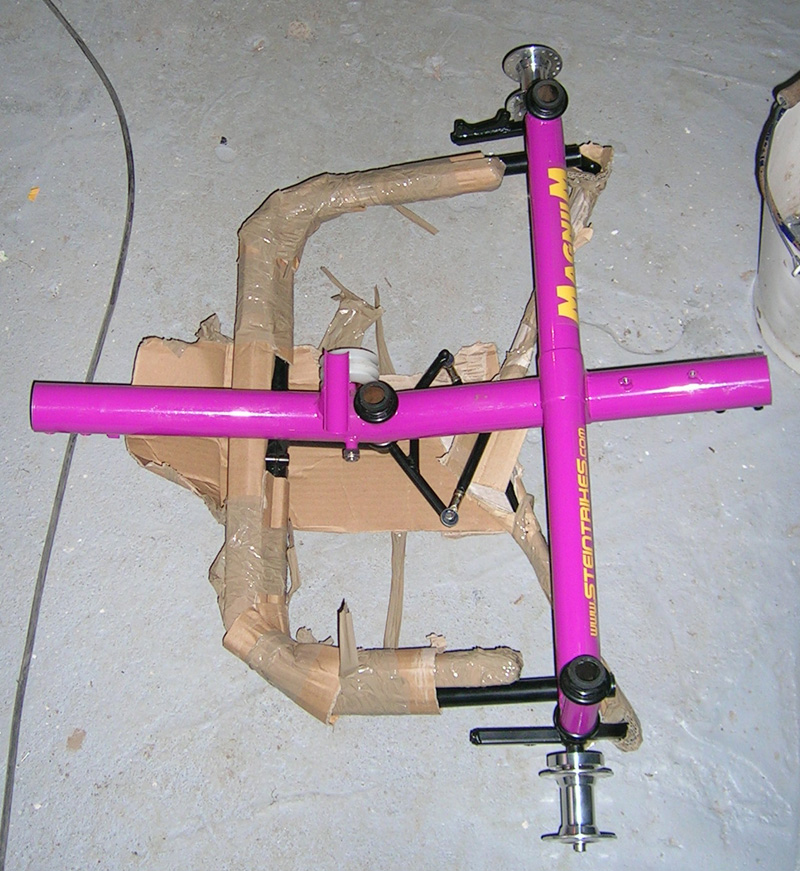 Kurz vor Weihnachten 2007 kam dann der Rahmen. Es ist wirklich viel verändert gegenüber meinem bisherigen. Der Mittelteil ist ein fest verschweißtes Dreieck (wie bei Greenspeed), die Sitzwinkelverstellung funktioniert jetzt wie bei allen aktuellen Steintrikes ohne die Rahmenklemmung lösen zu müssen, die Synchronkette wird über eine exzentrisch gelagerte Rolle gespannt, nicht mehr durch Tretlagerverstellung, usw.