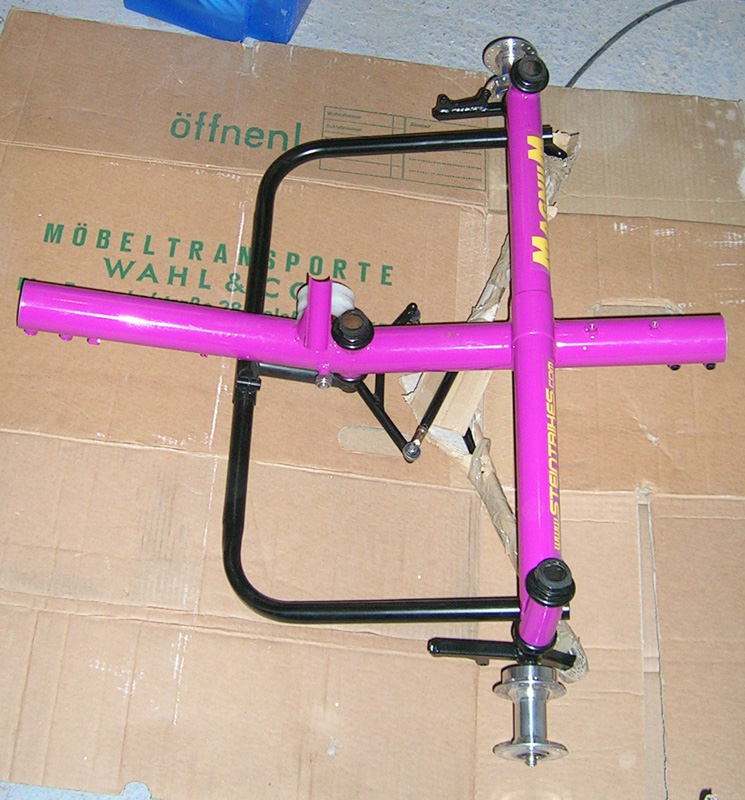 Etwas früher hatte ich jedoch schon gehört, daß die Achsschenkelkonstruktion geändert wurde, um den Radausbau zu erleichtern: Statt eines eingeschweißten Achsstummels (erkennbar ein Drehteil) wurde lediglich ein Rohrstück angeschweißt, das eine handelsübliche Maschinenschraube aufnimmt. Durch die neuen Achsschenkel kam ich nun in den Genuß dieser Änderung, was mein Vertrauen in die Haltbarkeit der Achsstummel wieder deutlich erhöhte. (Aber merkwürdig ist schon, daß 12er Vorderachsen, die bei Greenspeed und ICE/Trice an Tandems halten, bei Steintrikes mehr als ein mal am Solorad brachen.)