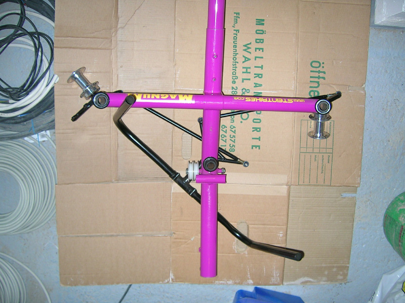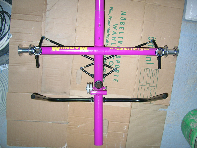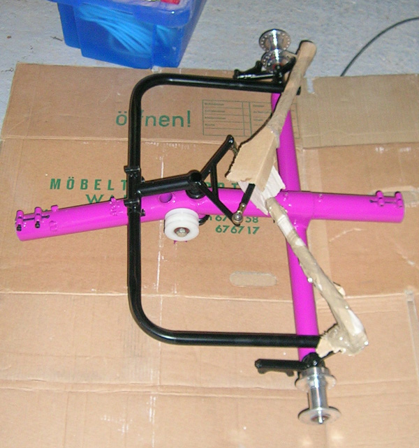 Nach einer weiteren längeren Pause versuchte ich den Rest zusammenzusetzen. Das gelang allerdings nicht ohne Probleme und an einem Punkt gar nicht. Die neuen Beilaghülsen für die Rahmenklemmungen waren zu dick (das war mir schon im Mai 2006 aufgefallen), nach Rücksprache mit Thomas Seide kürzte ich sie, mit etwas Wasser als Gleitmittel ließ sich dann auch der Tretlagerausleger montieren. Bei der Montage der Spurstangen (Februar 2007) fiel auf, daß die Spur des neuen Rahmenteils wohl etwas breiter ist, als die des alten, die Spurstangen waren zu kurz. Hat immerhin den Vorteil, daß der Wendekreis kleiner wird. Vor allem aber paßten die Spurstangen nicht an den Auslegern der Achsschenkel vorbei, an denen sie befestigt sind. Nachdem ich mich davon überzeugt hatte, demontierte ich die Achsschenkel wieder und verglich sie mit den originalen (und mit den unverstärkten ungepulverten Ersatzachsschenkeln Nr. 1). Die originalen waren nicht spiegelbildlich, anders als die anderen Paare. Dies teilte ich mit der üblichen Unmutsbezeugung Thomas Seide mit. Nachdem ich ihn zwei oder drei E-Mails später von der Sachlage überzeugt hatte, sagte er mir schnellstmöglich Ersatz zu, der auch recht zügig kam. Nur lackiert, nicht pulverbeschichtet, und wesentlich weniger verstärkt als das vorherige Paar. Ich wollte erstmal wissen, ob es jetzt endlich paßt und hab erstmal die Klappe gehalten.