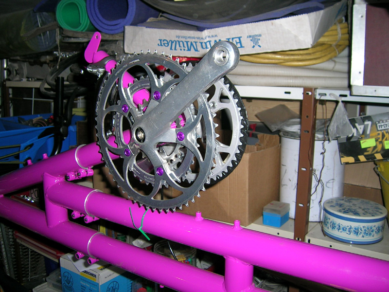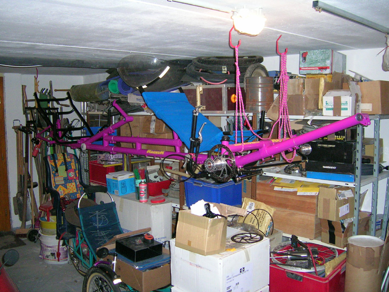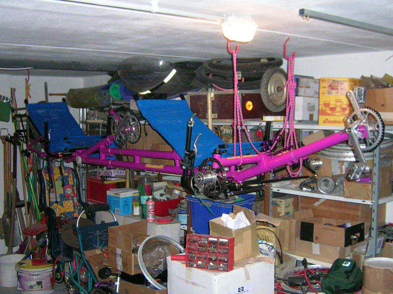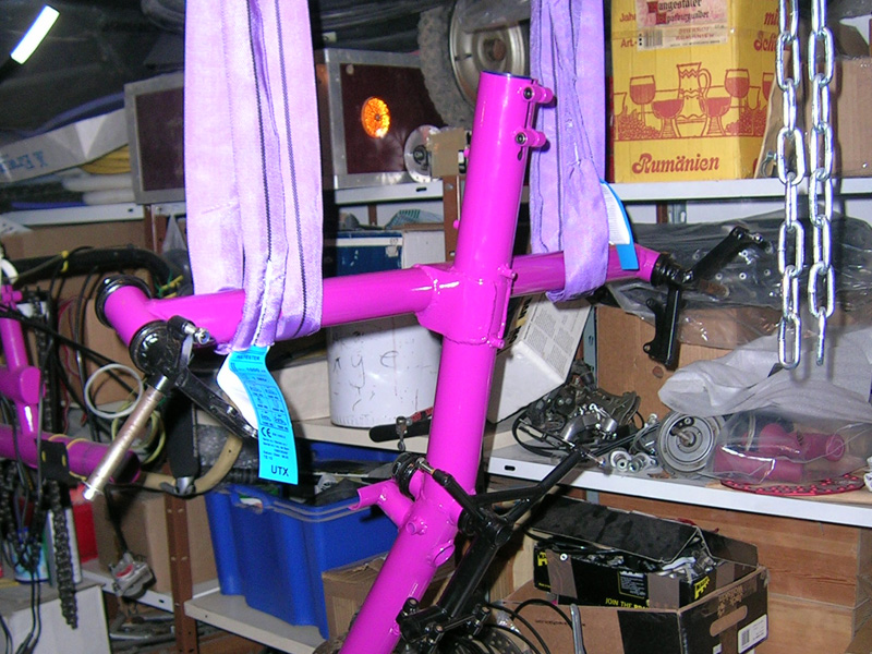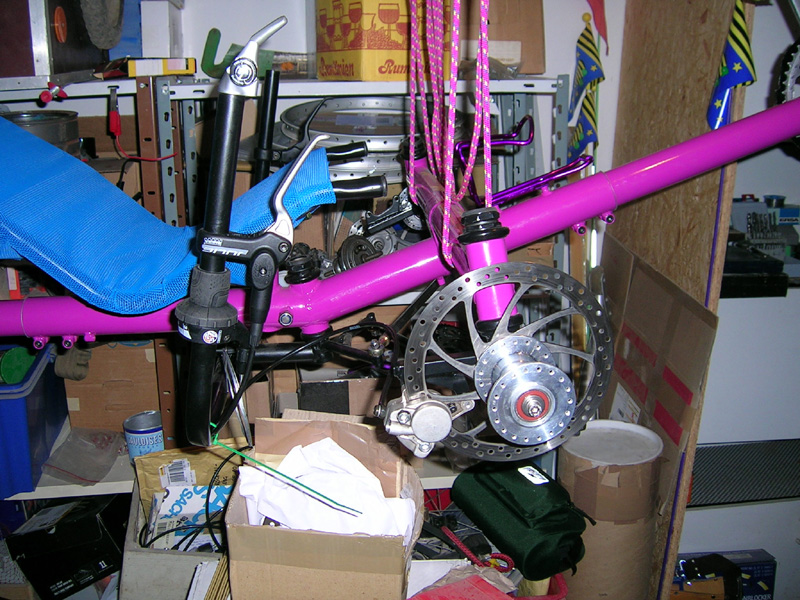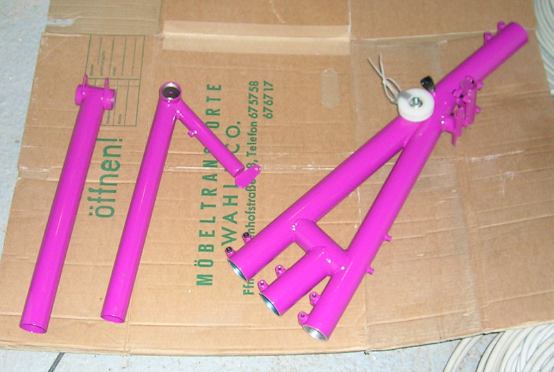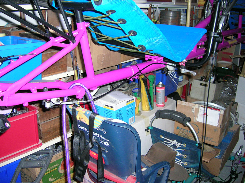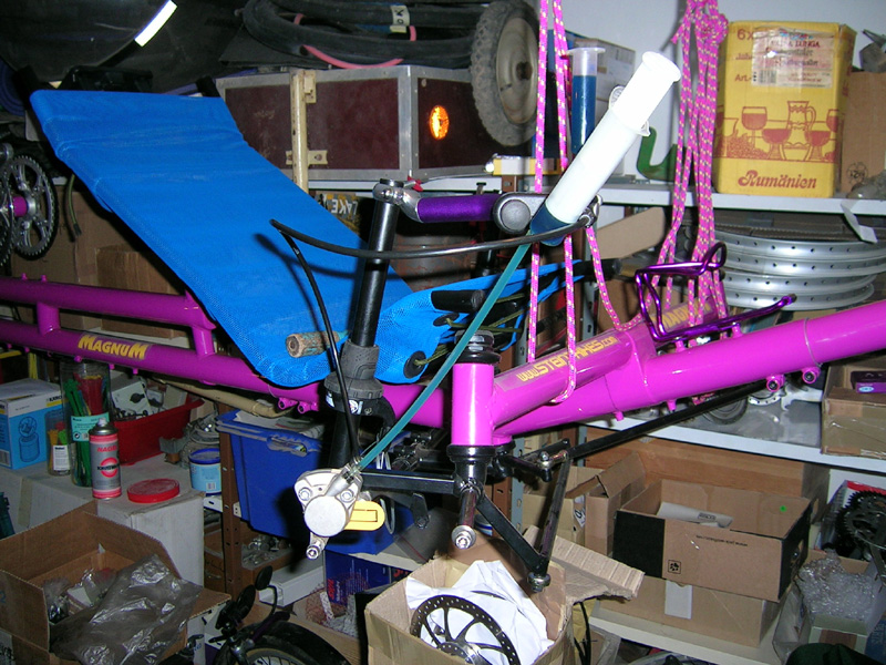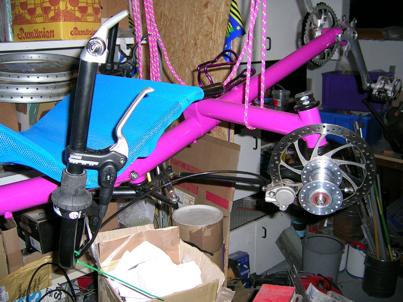 Nachdem ich Thomas Seide im Spätsommer 2007 nochmal eine lange E-Mail mit diesem Stand der Dinge geschrieben habe, hat er mir angeboten, daß ich einen komplett neuen Rahmen auf dem aktuellen Stand bekomme. Ich könne mir eine der Farben aus der aktuellen Palette aussuchen (meine damalige Wunschfarbe gehört natürlich nicht dazu). Ich fragte wegen verschiedener Sonderwünsche, die an meinem bisherigen Rahmen erfüllt worden waren (paßt mein Schwerlastgepäckträger, passen meine breiteren Sitze, könnte man nicht doch die evtl. noch beim Pulverbeschichter vorrätigen Reste meiner Wunschfarbe auftragen? ... ansonsten halt schwarz, von den anderen Farben paßt keine zu lila und pink) und in Bezug auf meine Links-rechts-Kettenführung bekam ich auch wieder eine Extrawurst gebraten (mit rechts-rechts kriege ich nicht genug Übersetzungsbandbreite zusammen)