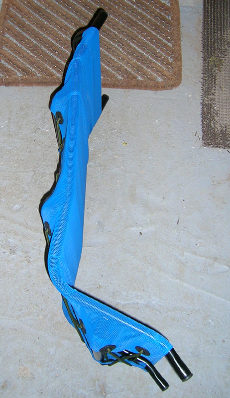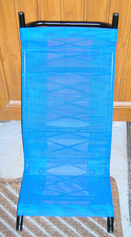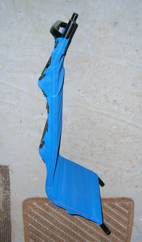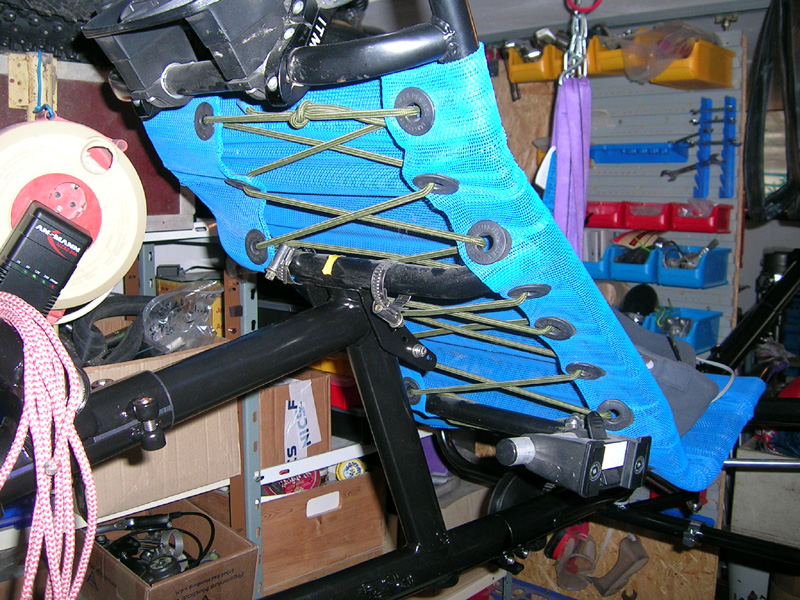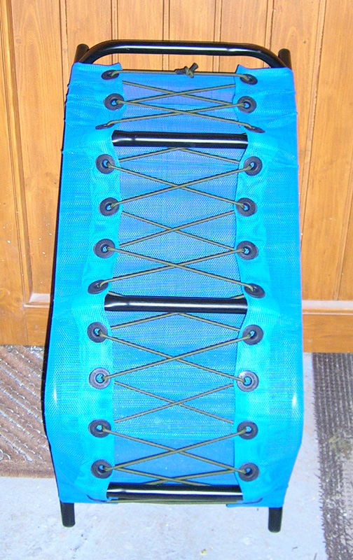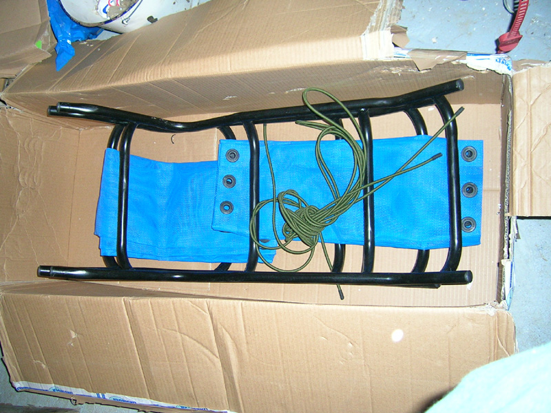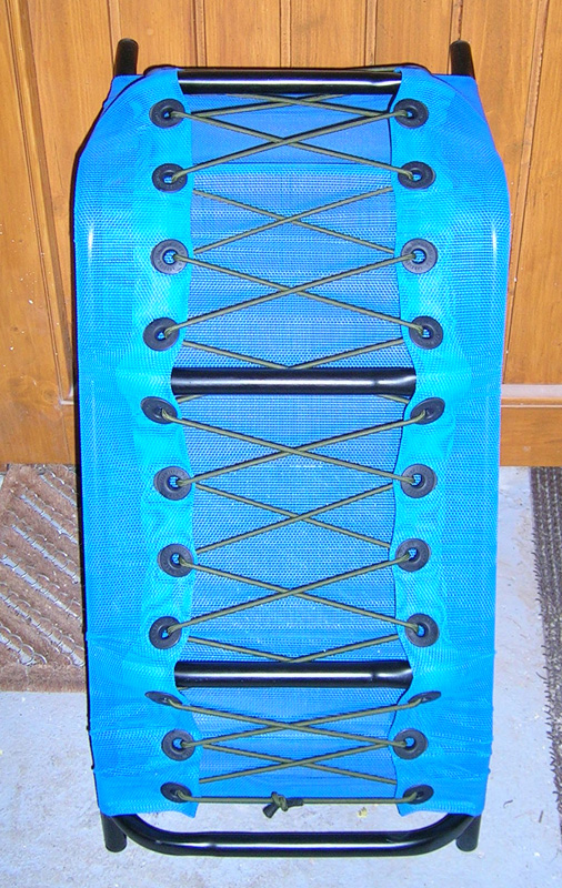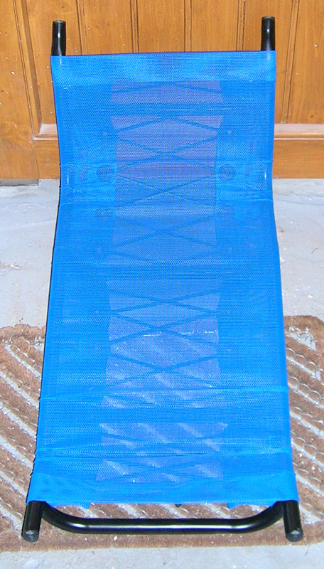 Einen Sitz bespannt. Die Gummischnur ist verdammt kurz. Damals beim Greenspeed war sie viel zu lang, aber hier paßt sie haarscharf – nachdem man ca. eine Stunde lang wie ein Berserker millimeterweise an jeder Öse Schnur nachgeschoben hat. Dafür sind die Enden der Schnur sehr schön verwahrt. :-)
