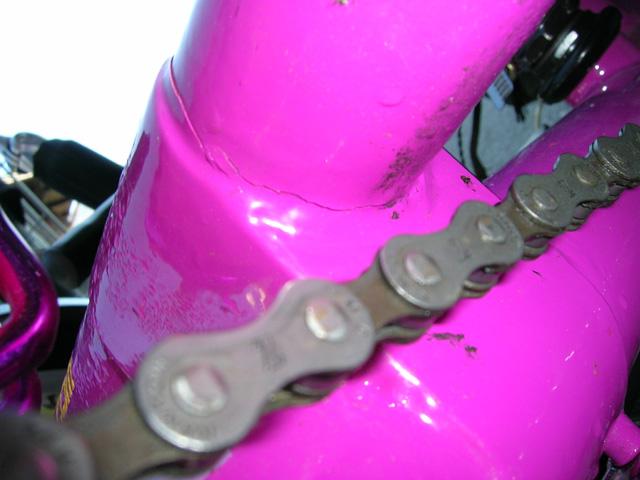 Bis jetzt eine ernsthafte Macke am Rahmen entdeckt, die aber vermutlich nicht weiter schlimm ist, weil sie an einem Rohrende ist, das in einem anderen Rohr verschwindet. Unklar, ob das vor dem Einpacken oder auf dem Transport passiert ist.