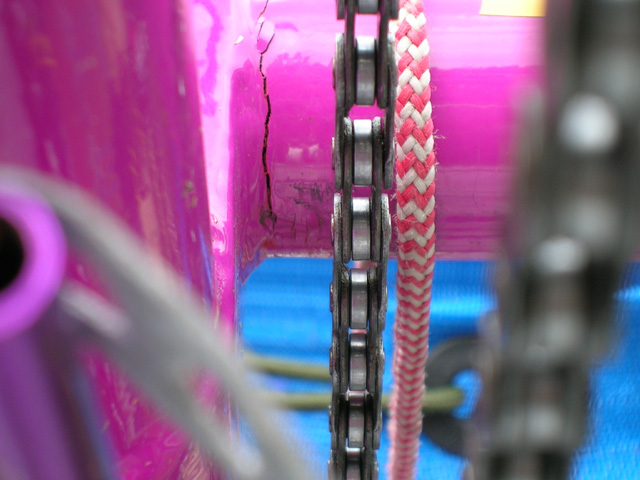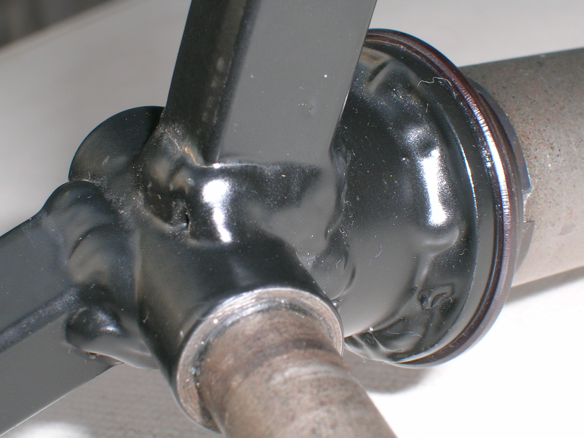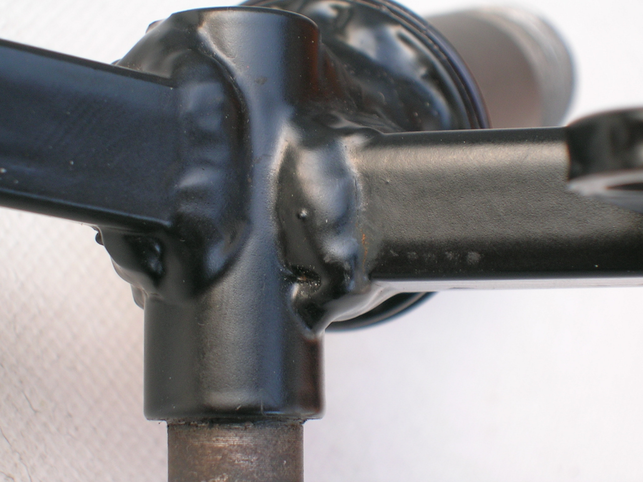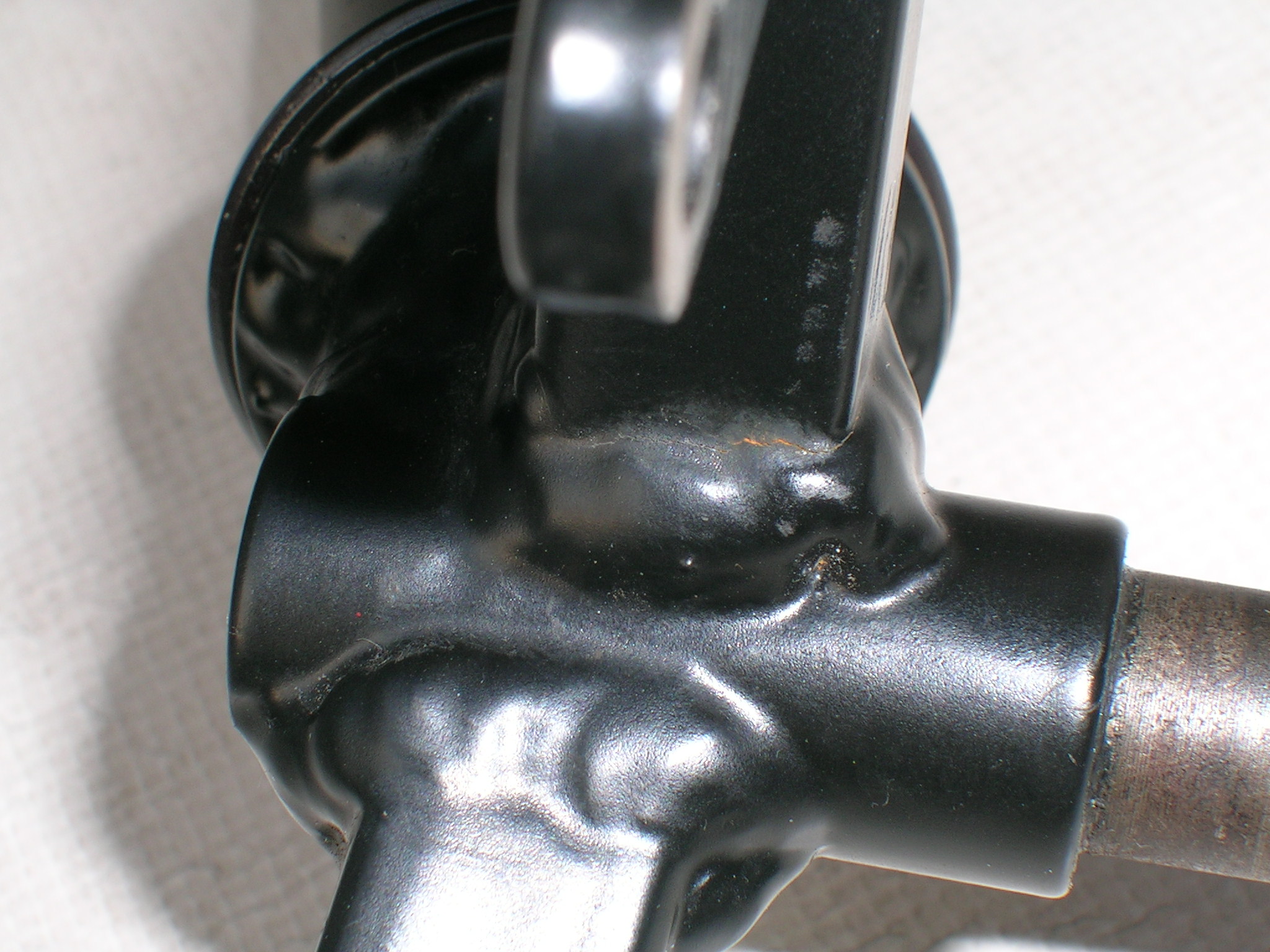 Es dauerte dann etwas, bis ich Zeit fand mich wieder um das Tandem zu kümmern. Ich begann zunächst das Vorderteil zu komplettieren. Da ich Jemandem im Kontext einer anderen Diskussion zeigen wollte, wie der Achsschenkel eines Trikes aussieht, machte ich ein paar Bilder – auf einem davon entdeckte ich einen Riß ... (April 2006)