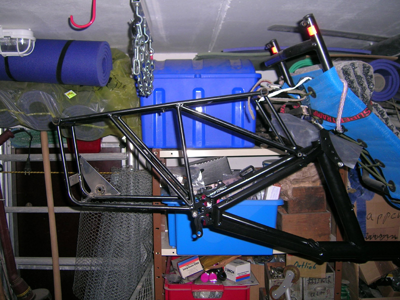 Im März 2008 habe ich dann den alten Rahmen demontiert und den neuen an die Kellerdecke gehängt. Als erstes zeigte sich, daß Thomas Seides Unkenrufe zu recht erschallt waren: Die Sitze passen nicht – die Querstreben sitzen an anderen Stellen. Als weitere unerwartete Komplikation erwies sich das Umwerferrohr auf dem Stoker-Tretlager, es hat 32 mm Durchmesser, nicht 28,6 mm wie vorher. Mein Gepäckträger paßt nicht (und von dem zwischendurch versprochenen neuen Gepäckträger ist nichts zu sehen und nicht mehr die Rede).